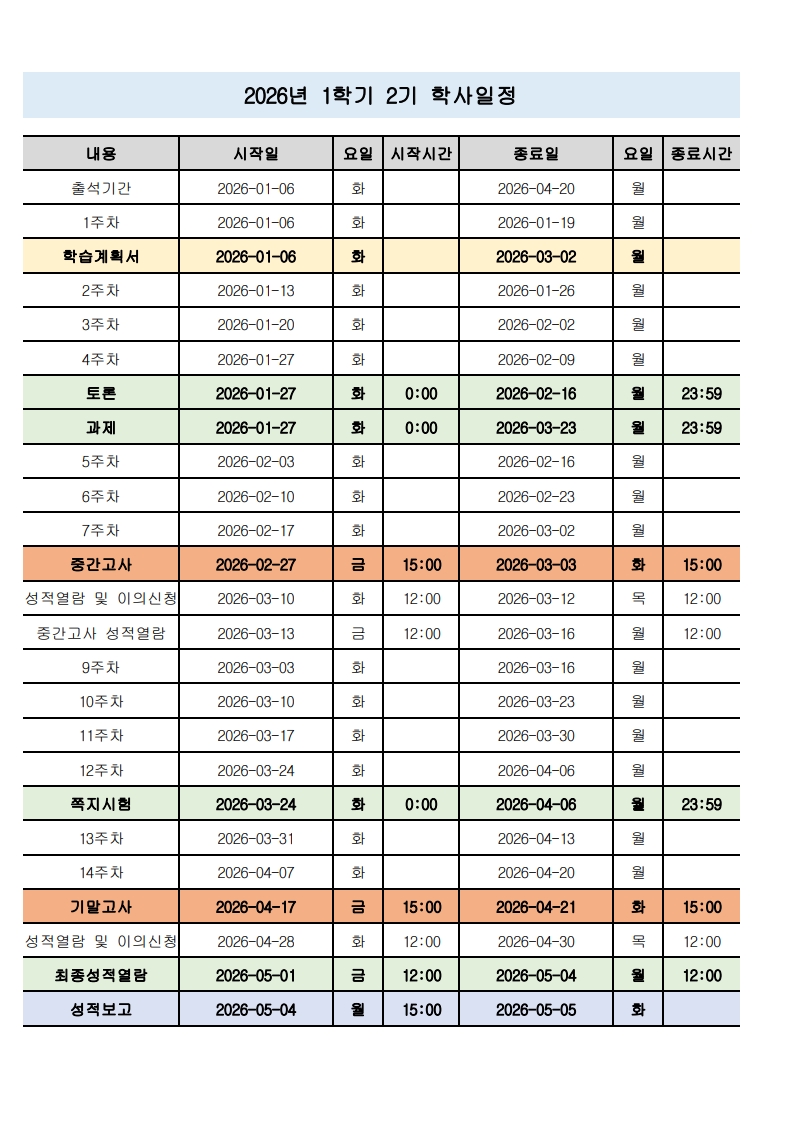 2026년 1학기 2기 (01월 06일 개강) 학사일정