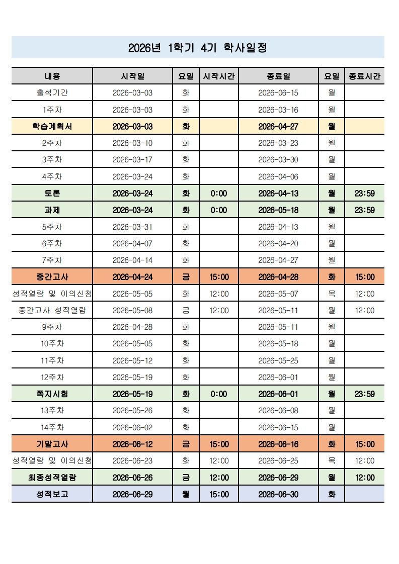 2026년 1학기 4기 (03월 03일 개강) 학사일정