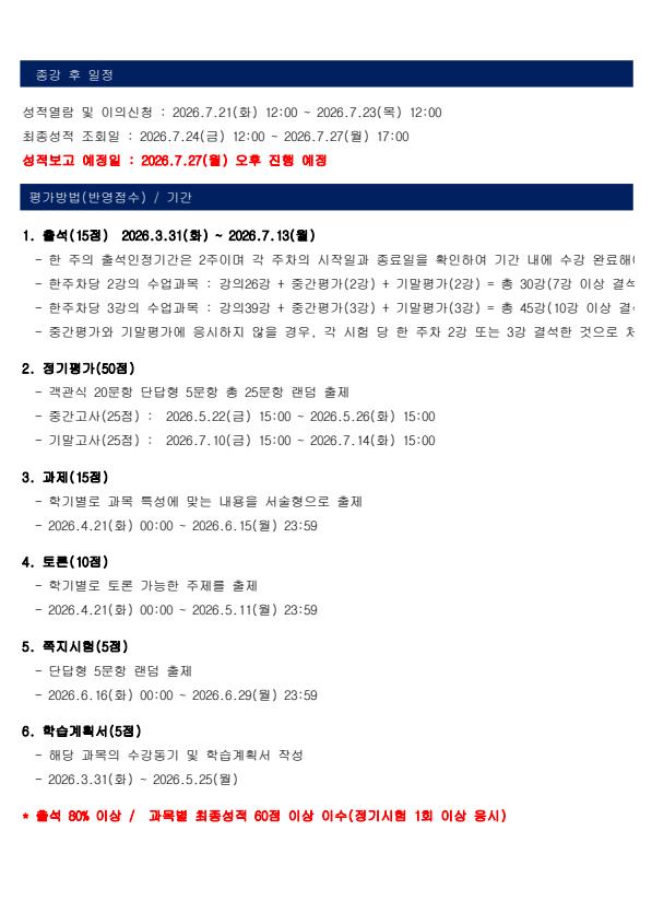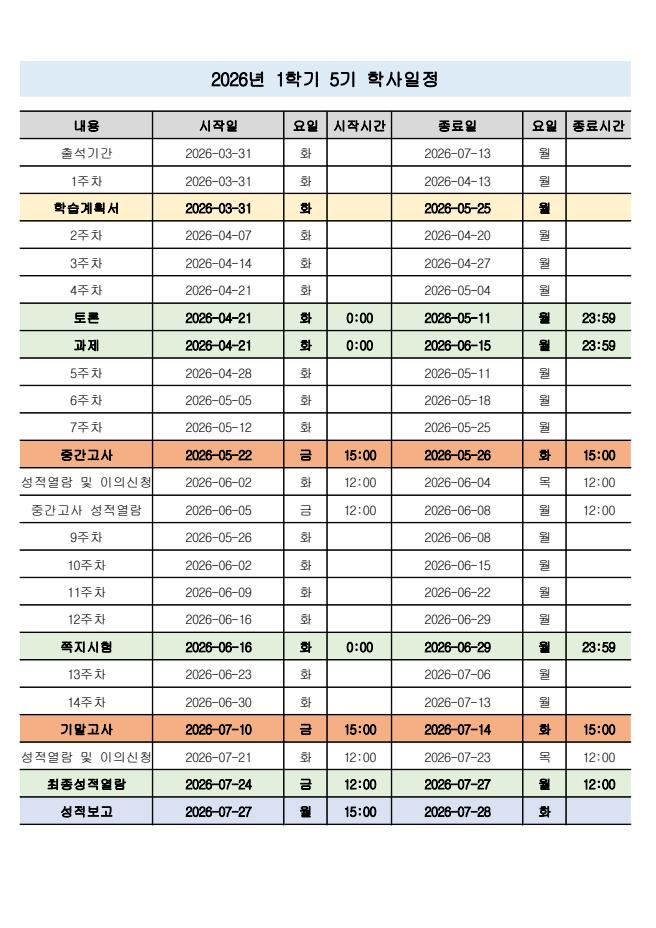 2026년 1학기 5기 (03월 31일 개강) 학사일정